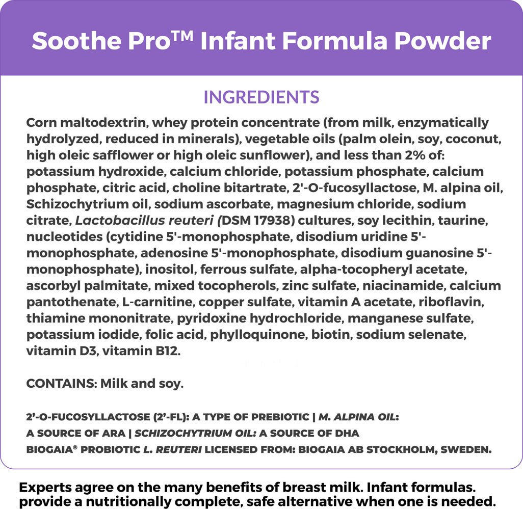 Soothe Pro infant formula provides complete nutrition and is specially formulated with 100% whey protein. An advanced 2-step hydrolysis process makes the proteins 10x smaller than intact cow’s milk proteins and the formula easy to digest. Soothe Pro infant formula promotes softer, more regular stools^1 and is formulated with probiotic L. reuteri*.